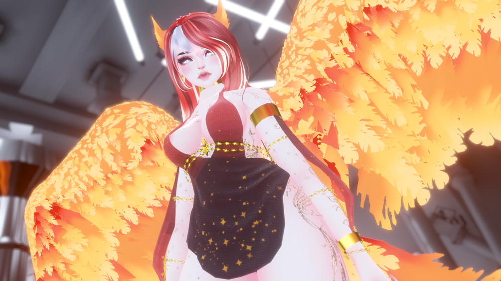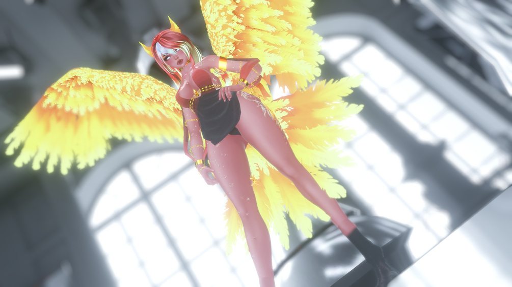 "With the beauty of a Phoenix, her fiery presence will sweep you off your feet in a single, mesmerizing swoop. But be warned—this radiance is not just for admiration. Beneath her sun-kissed feathers lies the untamed heart of a Harpy, ready to strike. Her elegance may captivate your senses, yet her sharp talons are never far, always ready to remind you of the danger lurking behind her allure. So, if you're bold enough, come and play with Solyore—if you dare to face the flames."